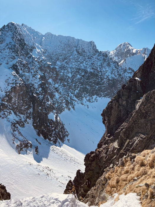I descend through the Komarnické rokliny with ice axes and crampons. It’s quick. Soon, I’m at Východné Batizovské seadlo. There’s barely enough snow here for skiing… I scramble a few meters down, put on my skis, and head towards Pasternákova priehyba.