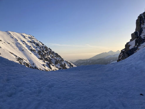 During the descent, I release small snow sluffs, so I stop and let them slide ahead, my thighs burning! I exit the couloir. Traversing towards the hut. The last fifty meters.