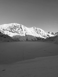 Above the lake, I take a breakfast break. Cheese, nuts, more cheese, and at 6:20, I set off towards Černý Stav below Rysy. I cross the frozen lake without paying much attention to what ’s under my skis, focusing intently on the ascent to Vyšná Kamzíčia Štrbina.
